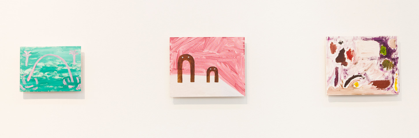 Lo que dispara el trabajo a veces es un elemento o una visión intrascendente, como el zapatito de una pintura tradicional que compré en una residencia en Ecuador y que veo todos los días en mi casa. Y lo que más me interesa es ese zapatito con taco y no me importa con qué lo voy a hacer convivir en mi pintura. Para vos son bolos, ¡para mi hermano son maníes! Y la literatura. Nada me hace más feliz que leer. Extraigo citas de lo que voy leyendo y de conversaciones, y las escribo en mi cuaderno. Muchas veces pierdo su referencia”. Hay pinturas con inclinaciones más ornamentales: patrones que se repiten como los lunares, los motivos sinusoides, los óvalos. Y una presencia profusa de jarrones y vasijas que son un guiño a la obra de la artista norteamericana Betty Woodman. Y hay flores (muchas flores) a la manera de la “pintura ingenua”, de artistas como José Luis Menghi, Luis Centurión, o incluso Mariette Lydis, en quienes Salinas puso atención y de quienes ha llegado a comprar alguna obra por internet. Y están las arquitecturas, construcciones y fachadas que muy lejos están del trabajo de Martín como arquitecto. Esas pequeñas maquetas, escenografías y escenarios que se ven en las pinturas, algunas con cuadrículas torcidas y fuera de todo orden, con cortinados, bordes con formas onduladas como de repostería, parecieran estar proyectadas por un arquitecto de fantasía que tiene como clientes a esos personajes representados en las mismas pinturas: el hombre de cabeza demasiado grande por exceso de neurosis; los bolos ¿o maníes? con tacos; el cara de huevo que sonríe por una ventana; las herraduras con ojos desconcertados; el pequeño snowman que espera solitario junto a una torre brancusiana... Como un pintor viajero al que le retuvieron el pasaporte y que sueña con la urgencia de renovar la mirada, Salinas incluye toda una serie de “paisajes atmosféricos” que comparten cierta condición de lo inacabado, que responden a una forma de pintar y dibujar que mantiene hace años y que se separan, tal vez, de todo el resto.